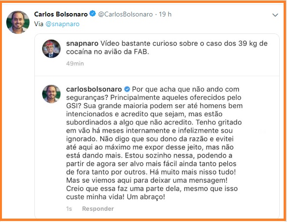 Uma página de extrema-direita no Twitter, a @snapnaro, traz um vídeo de uma senhora chamada Regina Villela, identificada como jornalista, segundo quem o sargento Manoel Silva Rodrigues, flagrado, na Espanha, com 39 quilos de cocaína num avião da FAB que serve à Presidência, pertence a uma estrutura muito maior. Sabem qual? Sim, ele, o Foro de São Paulo!